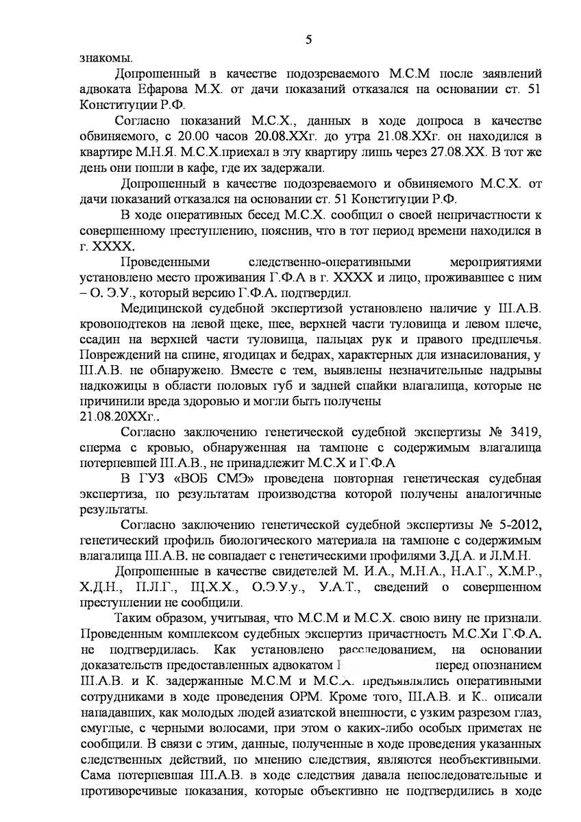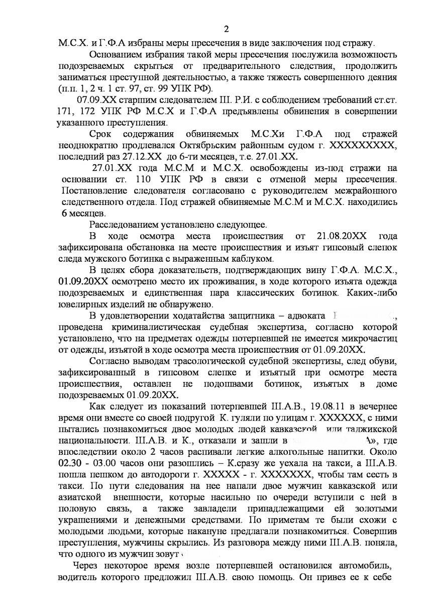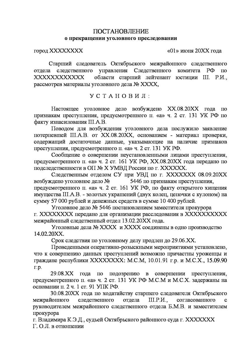 Адвокат в Красноярске добился прекращения уголовного дела на стадии предварительного расследования по реабилитирующим основаниям в отношении двух граждан иностранного государства обвиняемых органами предварительно следствия в совершении преступления предусмотренного п. «а» ч.2 ст.131 УК РФ (изнасилование совершенное группой лиц) и п."а" , п."г" ч.2 ст.161 УК РФ (грабёж), наказание за которое предусматривает лишение свободы от восьми до пятнадцати лет, то есть преступление, которое в соответствии с ч.5 ст.15 Уголовного Кодекса Российской Федерации отнесено к категории особо тяжких преступлений.
